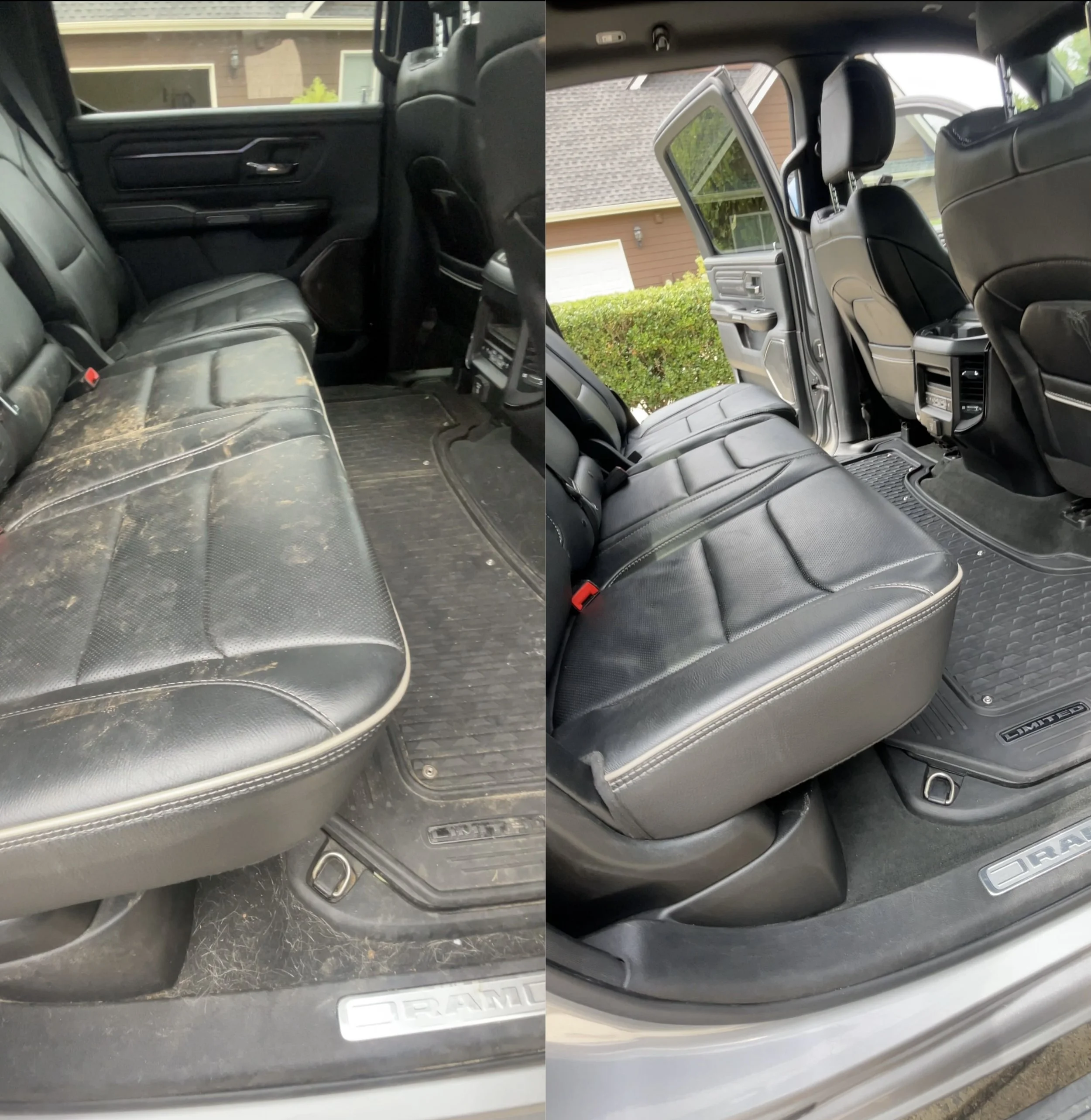 Problem: This Ram was used daily with dogs riding in the back seat and the interior showed it. The back seats and floorboards were covered in dirt, dust, debris, and dog hair, and the leather had lost its clean look under layers of grime. The owner wanted to bring the truck back to a state where it could be used not only for work, but also for family trips and personal use without embarrassment.